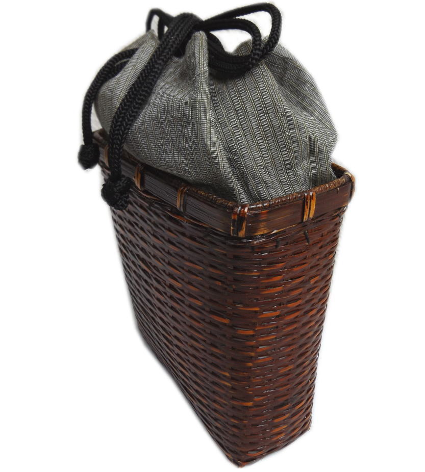 (サイズ):縦約14.5cm(巾着生地含22cm)・横約14〜15cm・マチ5〜7cm (素材):表地ー綿100%・裏地ーポリエステル65%・綿35%/竹かご/中国製